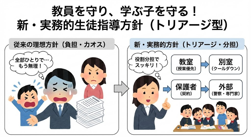 「誰でも実施可能」で「教員を守りつつ、学ぶ意欲のある生徒を守る」ための、現実的かつドライな『新・実務的生徒指導方針(通称:トリアージ型指導方針)』と、そのアクションプランをご提案します。