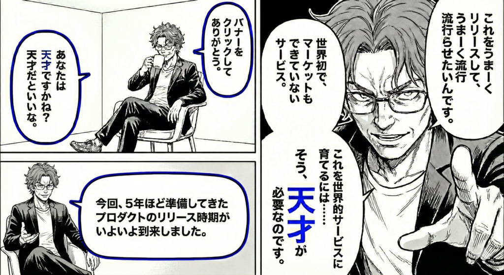 バナーをクリックしてありがとう。あなたは天才ですかね?天才だといいな。今回、5年間/3億円ほどかけて準備してきたプロダクトのリリース時期が到来。これをうまーくリリースして、うまーく流行らせたいです。世界初で、マーケットもできたていないサービスなので、これを世界的なサービスに育てるには、天才が必要なのです。