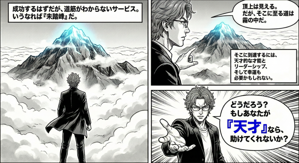 成功するはずですが、成功する道筋がわからないサービス。いうなれば、未踏峰。頂上は見えるけど、道筋はわからない。そこに到達するには、天才的な才能とリーダーシップだったり、さらにいえば幸運も必要かもしれません。どうでしょう? もしあなたが天才であれば、助けていただけませんか?