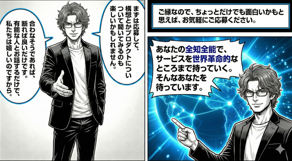 まずは応募して、構想とかプロダクトについて聞いてみるのも楽しいかもしれません。そのあと、合わなそうであれば、断れば良いだけです。会社側の担当者は、有能な人とお話するだけでも嬉しいものです。ご縁なので、ちょっとだけでも面白いかもと思えば、お気軽にご応募ください。