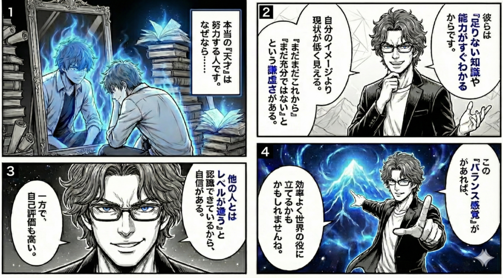 本当の天才は努力する人です。というのも、天才は「足りない知識や能力がすぐわかる」という特徴があって、そのために探求心が高く、少しストイックで、アグレッシブです。自分のイメージよりも現在の自分の能力が低く見えるので「まだまだこれから」「まだ充分ではない」という意識があります。 天才は自己評価が高い人でもあります。矛盾しているようですが、「他の人とはレベルが違う」ことは認識できているので、自分に自信があります。堂々としている気もします。