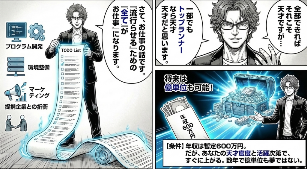 ざくっとした条件。年収600万円ぐらい。少なくて申し訳ないですが、実際に天才的な活躍ができるまでは、このぐらいでご勘弁ください。才能が認められ、やめられると困ると思えば、それなりの年収にすぐ上がります。さらに、利用者が増えて収益があがれば、プロデューサーの収入は素直に増えます。あなたの天才度次第ですが、数年で億単位も可能だと思います。